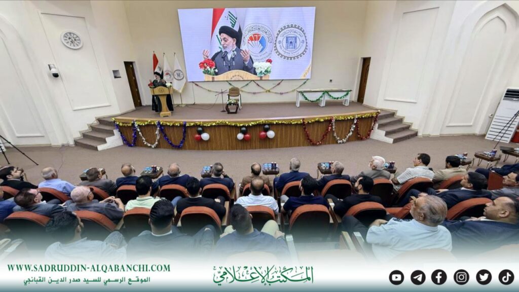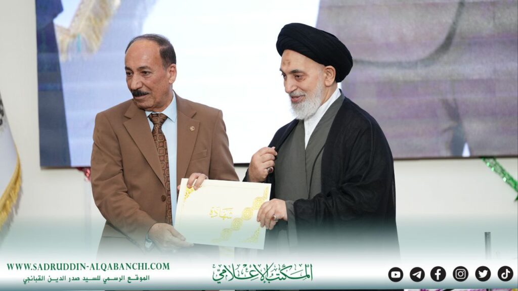 سماحة السيد صدر الدين القبانجي في كلمته في الاحتفال المركزي الذي أقامته الجامعة الإسلامية في النجف الأشرف، أكد سماحته قائلاً: إن نهج الحضارة الإسلامية هو الذي يمثل نهاية التاريخ، وليست الحضارة الغربية، وذلك استناداً إلى قوله تعالى: “هو الذي أرسل رسوله بالهدى ودين الحق ليظهره على الدين كله ولو كره المشركون”.